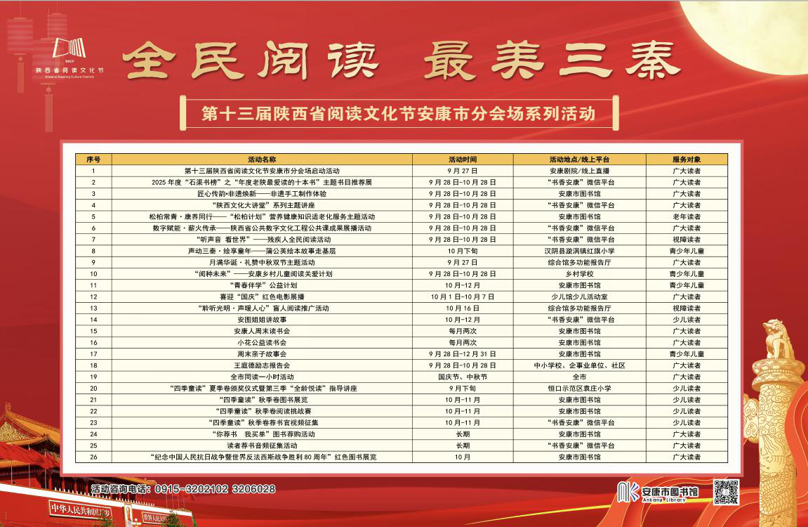 在中华人民共和国成立76周年之际,为深入贯彻党的二十大、二十届三中全会精神,落实习近平文化思想,安康市图书馆积极响应《陕西省文化和旅游厅关于举办第十三届陕西省阅读文化节的通知》要求,精心组织了26项线上线下系列文化活动,以“联盟主题活动+自主策划活动”相结合的方式,全力打造“书香安康”,为广大市民带来了一场丰富的文化盛宴。