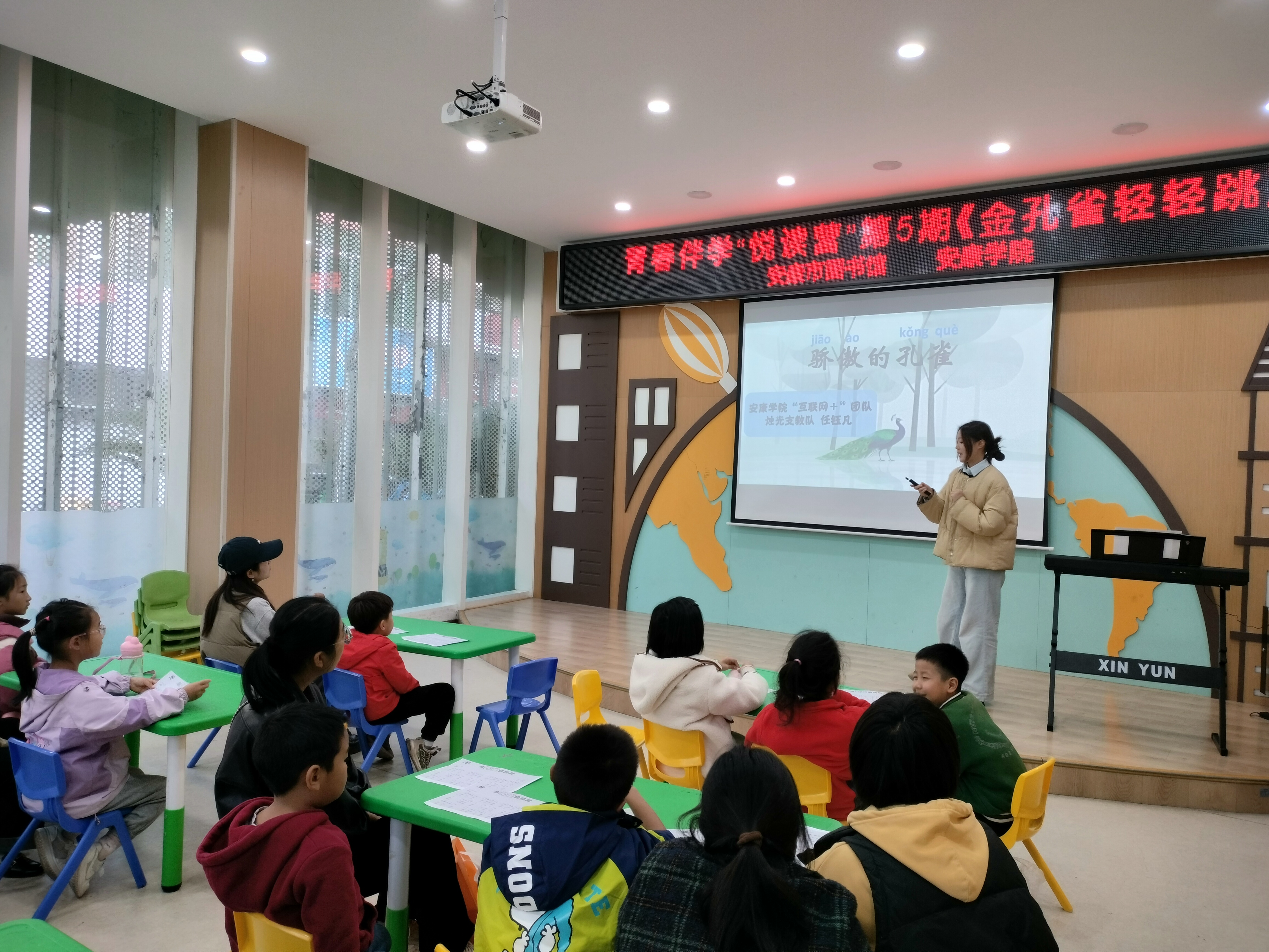 为促进公共文化服务与高校人才培养深度融合,丰富青少年课余文化生活,同时拓展大学生社会实践平台,11月15日,安康学院筑梦和烛光支教队的队员一起走进安康市图书馆少儿活动室,为孩子们带来了一堂生动有趣的音乐课——《金孔雀轻轻跳》,活动吸引了 15组家庭积极参与。课程以傣族民歌为素材,融合歌曲与文化讲解,让孩子们在欢乐的氛围中感受民族音乐的独特魅力。